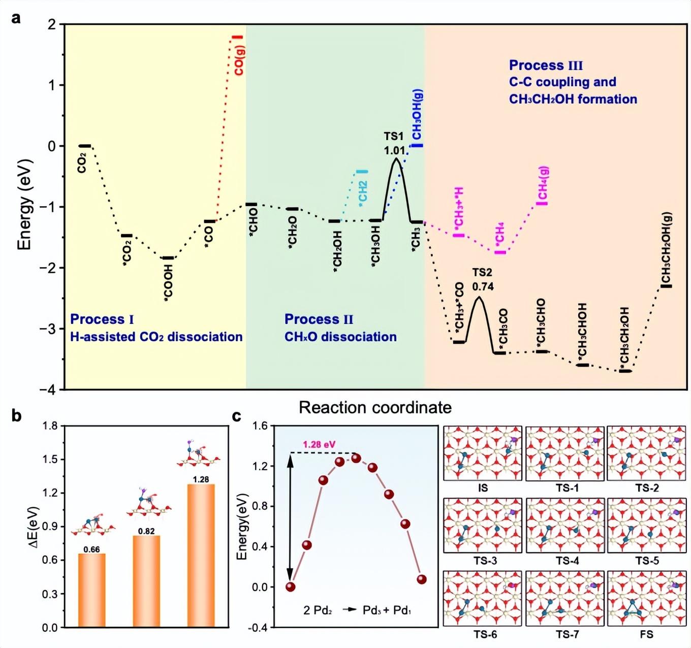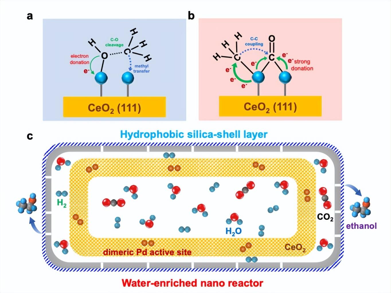 图3. 双钯活性位点促进乙醇生成的作用机制(a,b)和结构封装双钯活性位点-纳米“蓄水”膜反应器的结构示意图(c)