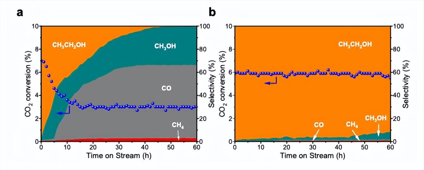图2.结构封装双钯活性位点-纳米“蓄水”膜反应器(a,无蓄水功能的结构封装Pd2Ce@Si催化剂;b,具有蓄水功能的结构封装Pd2Ce@Si16催化剂)对CO2加氢一步制乙醇的催化性能的影响