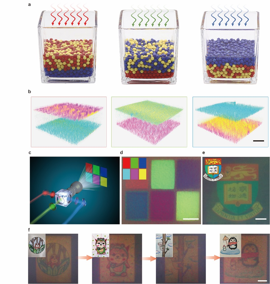 a、三元胶体系统中光谱敏感的分层分离的示意图,不同的照明光谱导致不同的垂直分层。