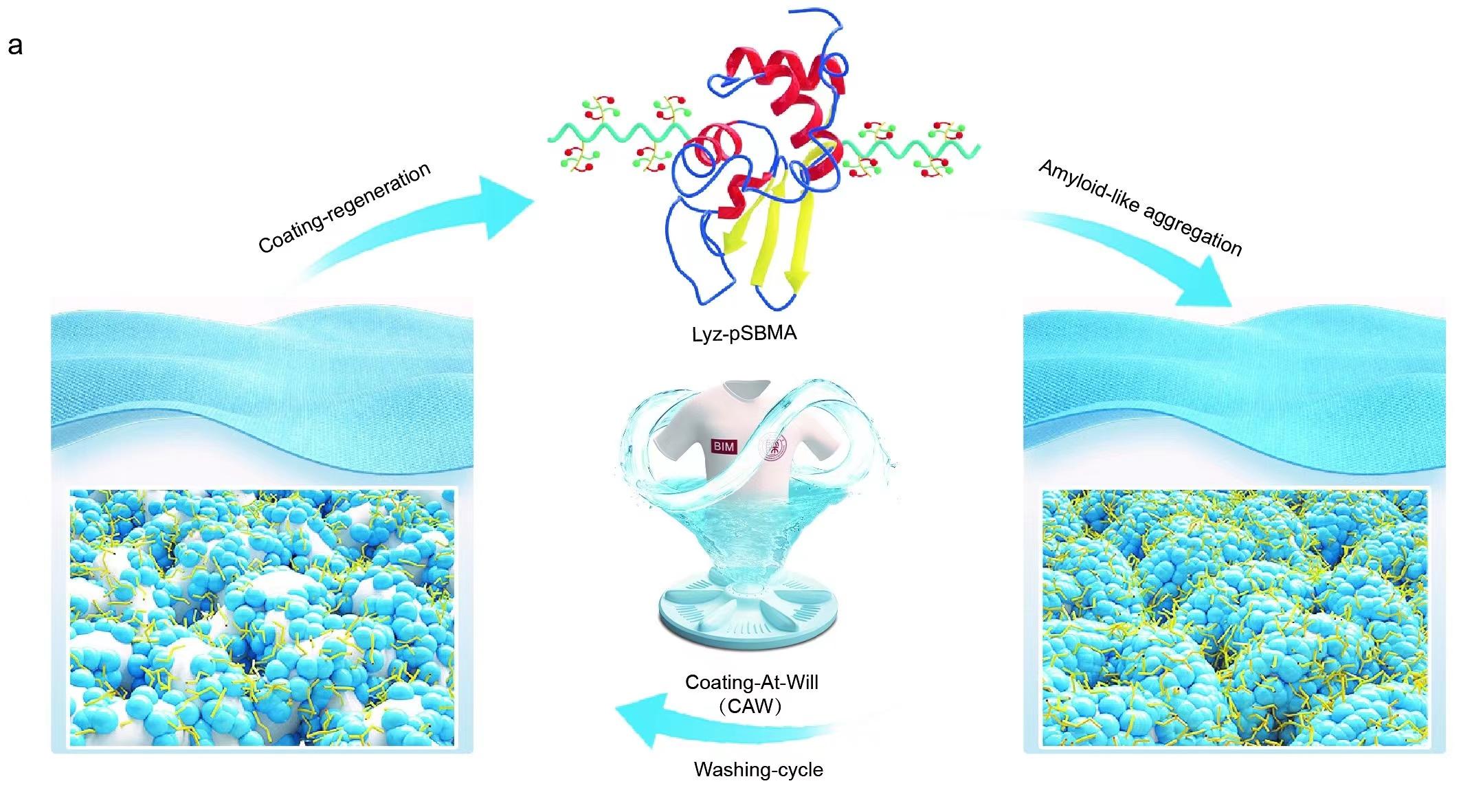 在可持续发展为导向的创新指引下,实现最大限度地减少洗涤剂在纺织品中的使用正受到越来越多的关注。基于此杨鹏课题组首次报道了一种“随意涂”(Coating -At-Will, CAW)的概念。该概念打破传统洗涤方式,通过简单的水洗就可以达到对织物表面油污渍清洗的效果。对比现有织物表面改性技术,CAW概念的精髓在于通过随时随地的轻松浸涂、喷涂,抗污涂层可迅速在织物表面稳定再生,从而解决了传统改性织物在反复洗涤后涂层脱落的问题(涂层可无限次再生)。该概念的基础是利用到类淀粉样蛋白的快速溶解性、稳定粘附性和生物相容性。CAW概念的典型实施过程为蛋白质与两性离子聚合物偶联物在水中快速溶解,并与还原剂反应而触发类淀粉样转变,进一步通过浸涂、喷涂等方法在织物表面快速形成厚度为14 nm的纳米薄膜(PTL-pSBMA)。该纳米薄膜具有优异的无色透明性(透过率~100%)和生物安全性,不会影响织物的穿着舒适性和美观度。由于纳米薄膜具有优异的水下超疏油性,无需洗涤剂即可用水清除织物表面的油污渍。与传统洗涤剂相比,该策略可减少40%~50%水和电能的消耗,减少50% 以上碳排放量。该策略具有高性价比和低用量,因此具有极大的商业潜力,有望针对目前主流织物洗涤清洁方案产生变革性推动作用。这类功能性涂层的再生设计CAW概念有望进一步拓展到其他体系,从而极大推动社会、经济和环境的绿色可持续发展。