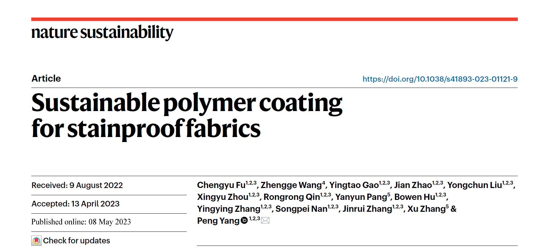 近日,我校化学化工学院杨鹏教授课题组“生物表界面与智能大分子研究团队”在《Nature Sustainability》《自然·可持续发展》杂志上在线发表了以“Sustainable polymer coating for stainproof fabrics”(用于织物防污的可持续聚合物涂层)为题的研究文章。我校为唯一通讯单位,2022级硕博连读研究生伏成玉同学为第一作者,杨鹏教授为唯一通讯作者。特别指出的是,我校化学化工学院笃学2001班本科生南松培参与了此项工作,并做出了重要贡献。