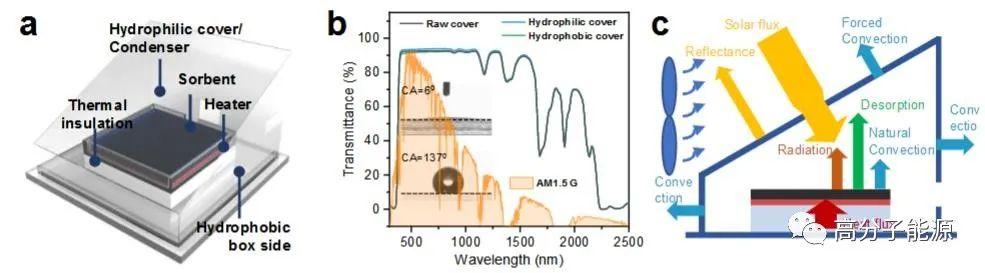 全天多循环大气集水示范。a)概念验证型大气水采集器示意图。b)未加工、亲水性涂覆和疏水性涂覆丙烯酸膜的紫外-可见-近红外光谱。插图显示亲水性盖(上)和疏水性盖(下)的水接触角。c)大气集水机能量流图。d)混合解吸模式下,白天运行的集水机各部件的温度变化。e)夜间以水蒸汽驱动解吸工作的集水机部件的温度变化。f)白天混合解吸模式下水采集器的温度梯度表示吸附剂的热局部化。g)日间混合脱附模式下集水机的蒸汽压梯度,显示了吸附剂与冷凝盖之间的显著蒸汽压差。h)全天各AWH循环的吸水量、放水量和集水量。i)全天多循环混合脱附AWH模式与东南或西南驱动的单循环AWH模式的日产水量比较