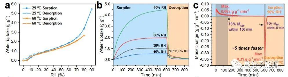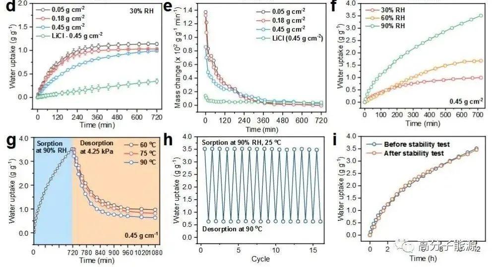 PAMPS-CNT-LiCl的水蒸气吸附-解吸性能。a) 25℃和60℃时的吸水等温线。b) DVScurves显示了pamps - cnt - licll在30℃下15% RH、30% RH、60% RH、90% RH不同工况下的动态吸水过程,以及在90℃(4.2 kPa)下6.0% RH工况下的动态解吸水过程。c) 30% RH下毫克尺度样品的导数吸水变化,突出了吸附和解吸时间的差异。d)在25°C, 30% RH条件下,湿室中测试的散装PAMPS-CNT-LiCl样品和不同比重的LiCl的动态吸附曲线,显示了样品尺寸对吸附动力学的影响。e) 30% RH条件下大体积样品的导数吸水性变化。f) 30%、60% RH和90% RH条件下,0.45 g cm-1 PAMPS-CNT-LiCl体积样品在30°C条件下的动态吸附曲线。g) 0.45 g cm-1 PAMPS-CNT-LiCl体积样品在60°C、75°C、90°Cand4.2 kPa条件下的动态解吸曲线。h)在25°C, 90% RH的吸附和90°C, 4.2 kPa的脱附条件下进行了15次水吸附-脱附循环试验,表明有满意的水吸附-脱附循环稳定性。i)循环试验前后90% RH的动态吸附曲线表明吸附动力学性能没有恶化