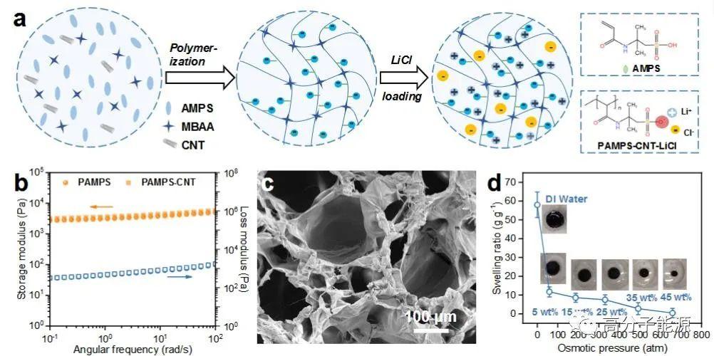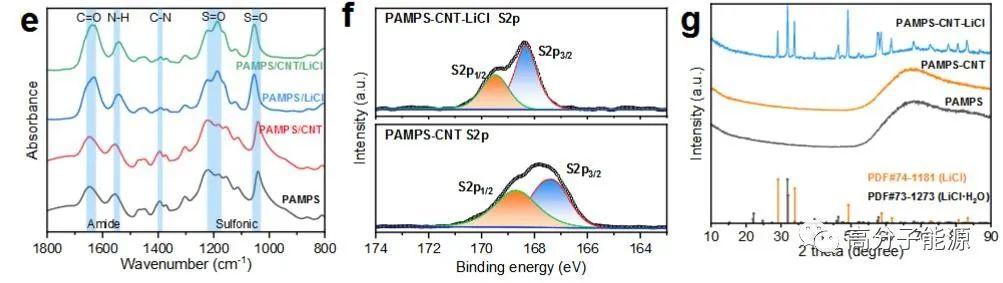 PAMPS- cnt - licl水凝胶吸附剂的制备和表征,自由和协调licl。a) PAMPS- cnt - licl水凝胶制备过程示意图。b)动态力学分析显示PAMPS和PAMPS- cnt水凝胶的储存模量(G′)和损失模量(G′)。c) PAMPS- cnt水凝胶在不同浓度LiCl溶液中的溶胀比,表明制备的水凝胶具有较高的渗透压。e)水凝胶的FTIR光谱,显示出S=O拉伸振动的明显移位峰。f) PAMPS- cnt和PAMPS- cnt -LiCl水凝胶的高分辨率S2p XPS光谱,显示了磺酸基的峰位和强度变化。g)水凝胶的XRD谱图,显示了无定形的PAMPS相以及LiCl和LiCl·H2O晶体贡献的尖峰