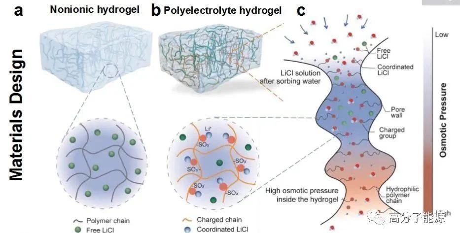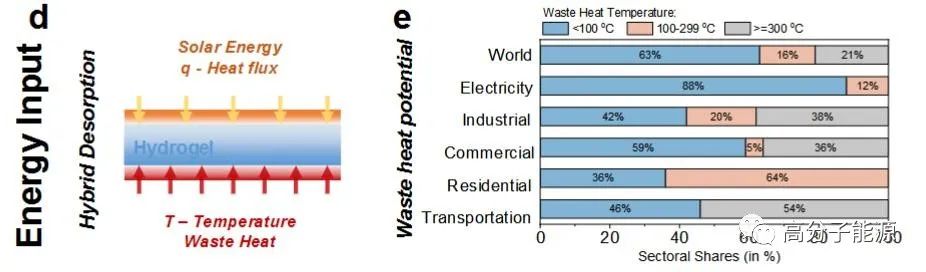 由可持续废热和太阳能驱动的大气水收集的水凝胶基材料平台示意图。a)非离子水凝胶和不与不带电聚合物链相互作用的自由LiCl示意图。b)具有配位LiCl和带相反电荷的亲水聚合物链的聚电解质水凝胶示意图。c)聚电解质水凝胶内部高效吸水、运输和储存示意图。水蒸气被孔壁表面自由配位的LiCl捕获,生成的LiCl溶液中被捕获的水分子由于强大的渗透压差被拉入水凝胶内部,促进被吸附水的转移和滞留。d)废热与太阳能耦合的混合解吸模式释水示意图。e)驱动解吸的所有部门的全球废热潜力