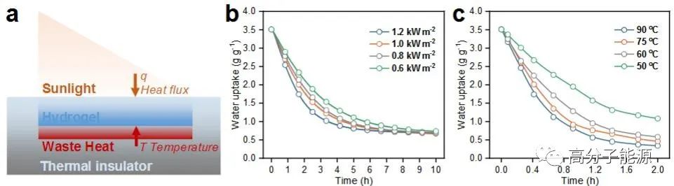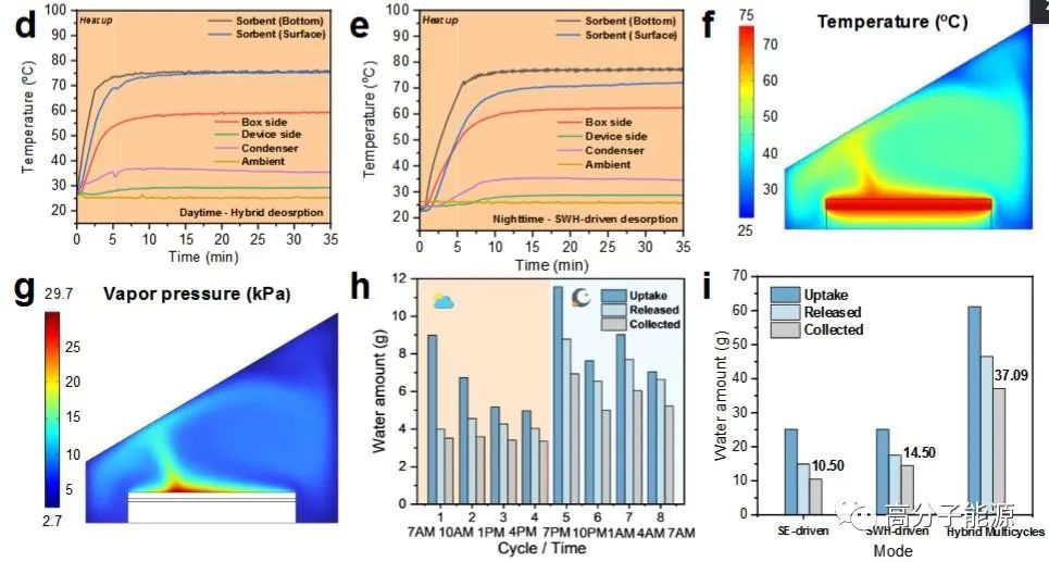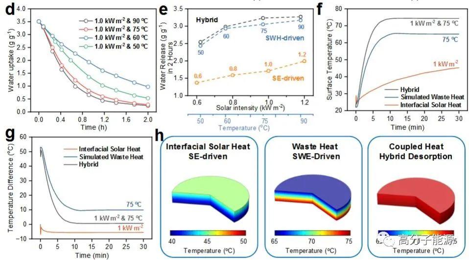 耦合能量源下PAMPS-CNT-LiCl的水蒸气脱附性能a)脱附性能评估装置示意图,显示了由电驱动焦耳加热器和太阳能(SE)输入代表的模拟废热(SWH)的位置。b)模拟太阳强度为0.6、0.8、1.0和1.2 kW/m2时se驱动的动态解吸曲线。c)源温度为50、60、75、90℃时swh驱动的动态解吸曲线。d)模拟太阳强度为1.0 kW/m2, SWH温度为50、60、75和90℃时的混合解吸曲线。e)测量了se驱动、swh驱动和混合解吸模式下,初始2小时解吸期间的释水量。f)模拟结果显示了PAMPS-CNT-LiCl水凝胶在se驱动、sw驱动和混合脱附模式下的表面温度变化。g) se驱动、swh驱动和混合脱附模式下PAMPS-CNT-LiCl水凝胶的温差变化模拟结果。h)在se驱动、swh驱动和混合解吸模式下,PAMPS-CNT-LiCl水凝胶在30分钟后的温度曲线