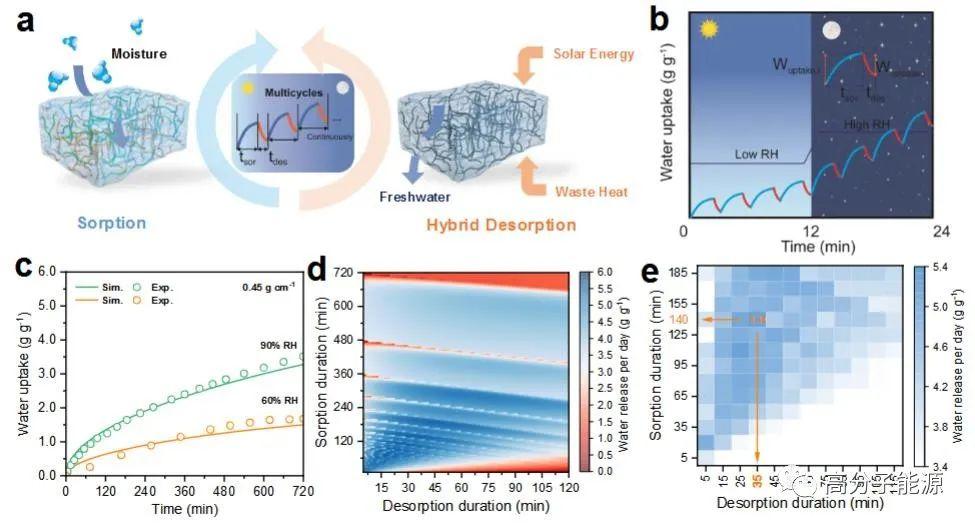 多循环吸附-解吸模式的概念及优化a)太阳能与废热耦合驱动的全天多循环AWH模式示意图。b)多循环AWH模式下的吸水模式及吸附-解吸持续时间示意图。c) 60% RH和90% RH下的模拟和实验吸水变化,显示FD模型的准确性。d)优化程序获得的根据吸附时间(20 ~ 180 min)和解吸时间(10 ~ 60 min)每天放水量的图形图。e)部分放大的图形图表示每天的放水量