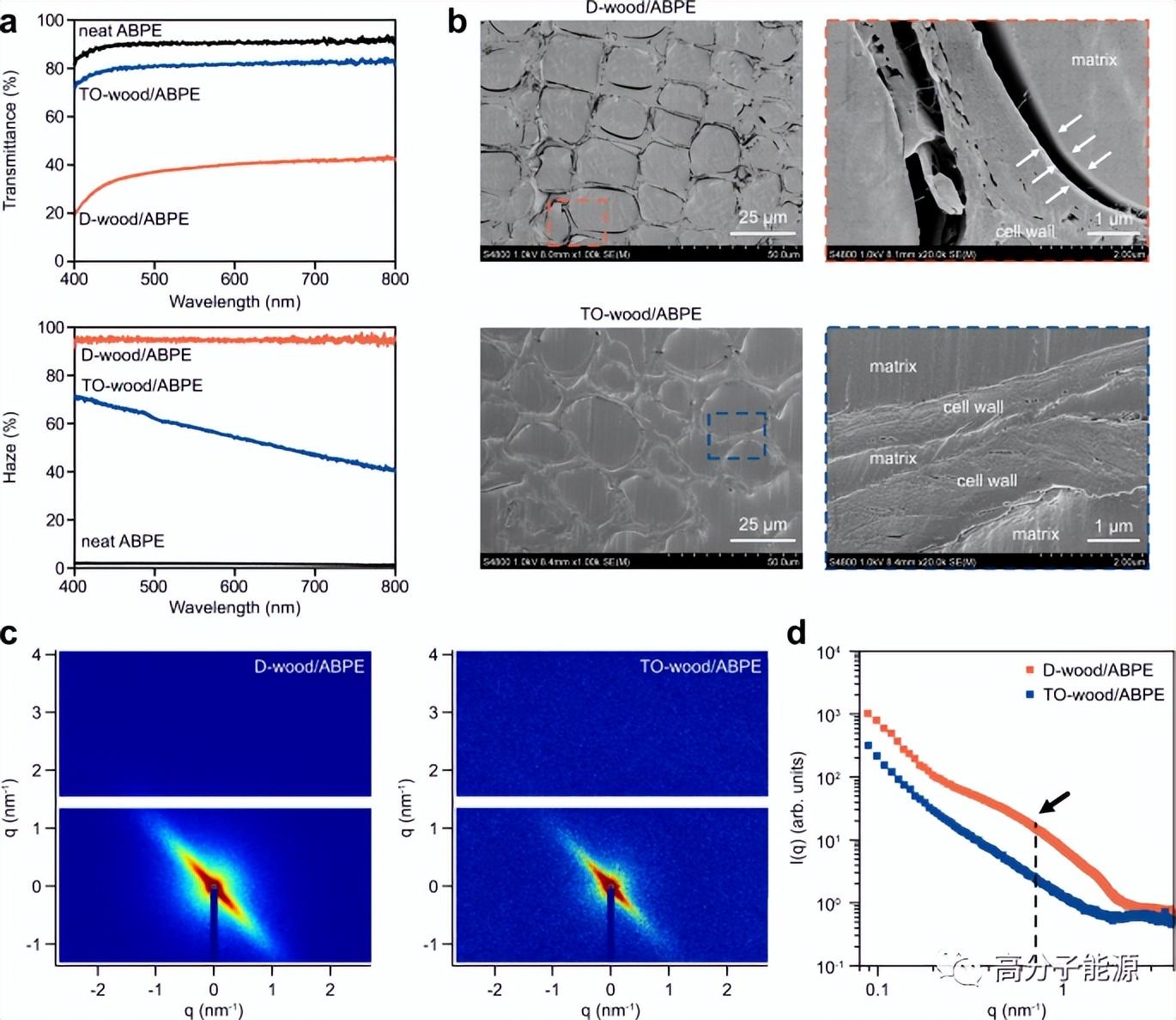 透明木材的光学特性和结构特征,a纯ABPE丙烯酸树脂片材、TO-wood/ABPE和D-wood/ABPE复合材料(厚度约1.10 mm)的总透光率和雾度。b D-wood/ABPE和TO-wood/ABPE复合材料截面的FE-SEM显微图。c D-wood/ABPE和TO-wood/ABPE复合材料的典型二维SAXS图。d散射强度,I(q),作为从二维图形的平均值提取的对数尺度上的散射矢量q的函数。黑色箭头表示肩峰位置。白色D-wood/ABPE和透明TO-wood/ABPE复合材料样品的照片如图1a所示。