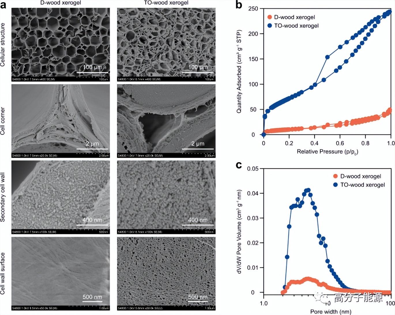 木材气凝胶的结构特性,d -木和to -木干凝胶的FE-SEM显微照片,分别显示了细胞结构、细胞角、次生细胞壁和细胞壁表面。b TO-wood和对应的D-wood干凝胶的氮吸附-解吸等温线。c基于非局域密度泛函理论的方法,由N2吸附等温线得到孔径分布。