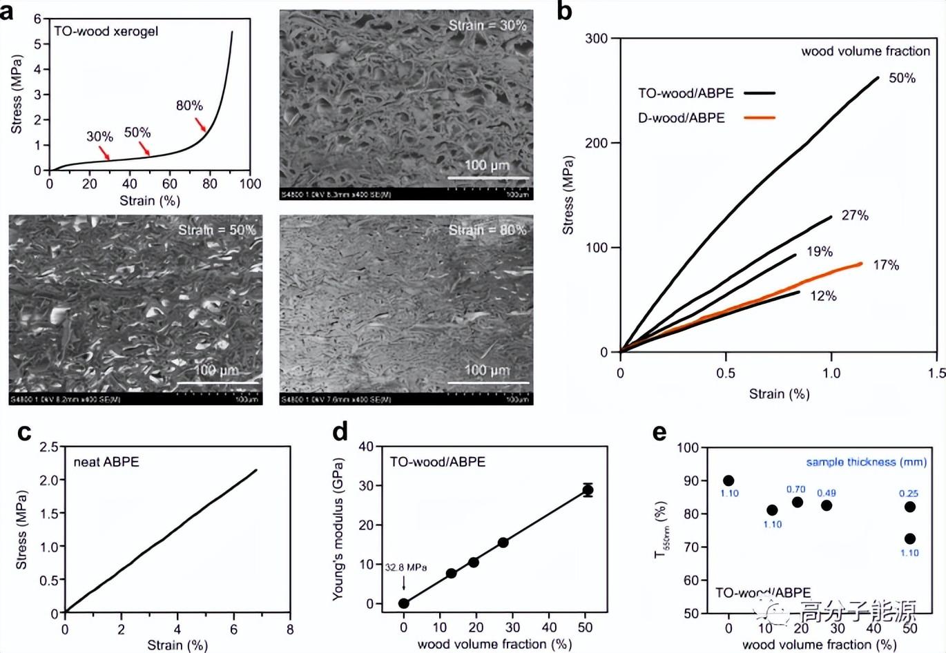控制木材在透明木材中的体积分数。图中为密度为185 kg m-3的TO-wood干凝胶的压缩应力-应变曲线,以及在压缩应变为30%、50%和80%时压缩TO-wood干凝胶的FE-SEM显微图。红色箭头表示在不同压缩应变下获得的干凝胶,用于FE-SEM分析和透明木材制备。b不同木材体积分数D-wood/ABPE和TO-wood/ABPE复合材料纵向拉伸变形的典型应力-应变曲线。c纯ABPE丙烯酸树脂板材在拉伸变形下的典型应力-应变曲线。d木材/ABPE复合材料的杨氏模量随木材体积分数的变化规律。e透明木材在550nm处的总透过率(T550nm)与木材体积分数和样品厚度的关系。