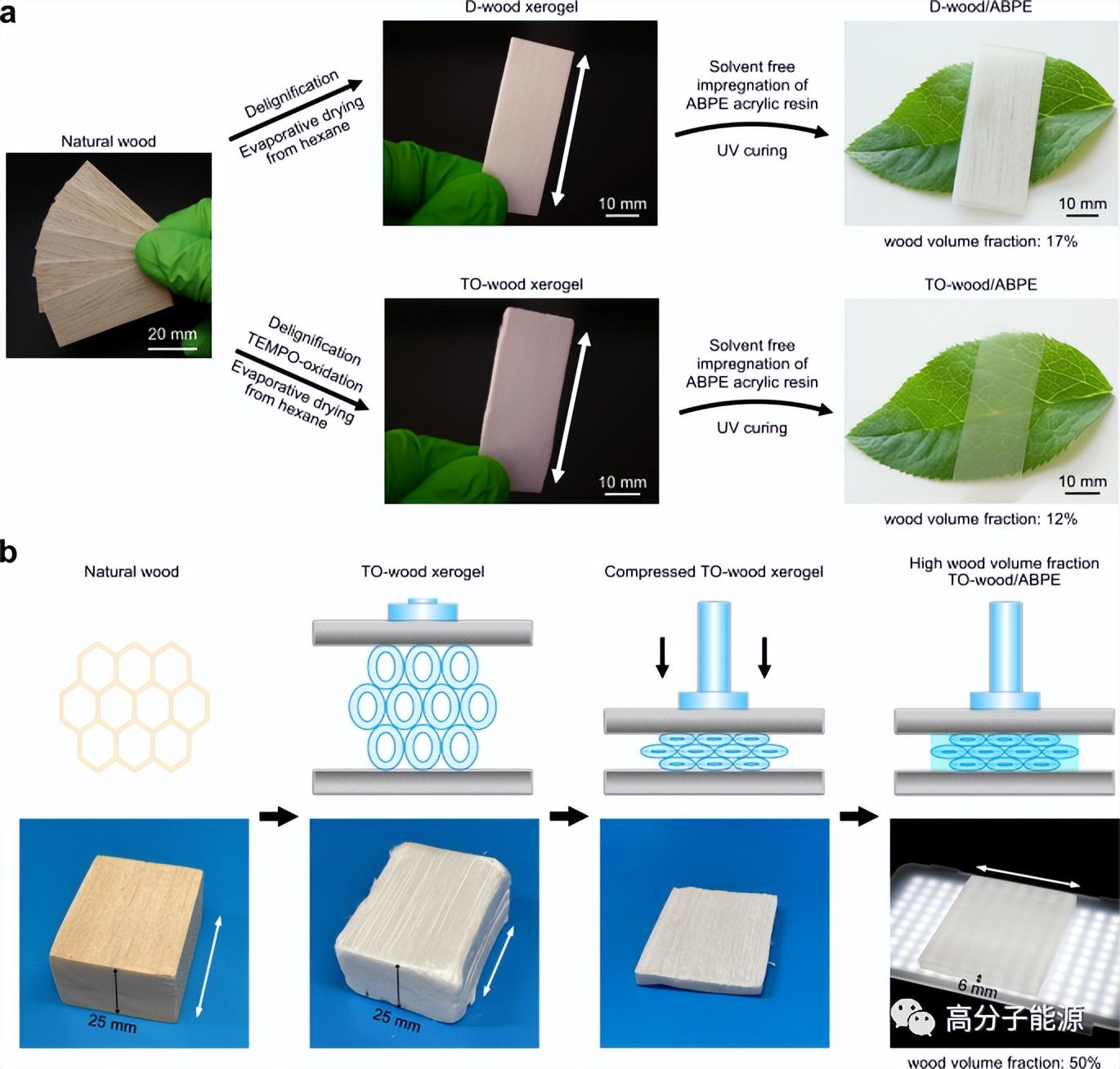 木材气凝胶和透明木材的制造。a图片显示白色D-wood/ABPE复合材料(木材体积分数为17%)和透明TO-wood/ABPE复合材料(木材体积分数为12%),由相应的D-wood和TO-wood干凝胶制备,白色箭头表示纤维细胞的轴向,与天然巴尔沙木相同。b压缩to -wood干凝胶以制备木材体积分数为50%的厚透明木材的示意图以及样品的相应照片。