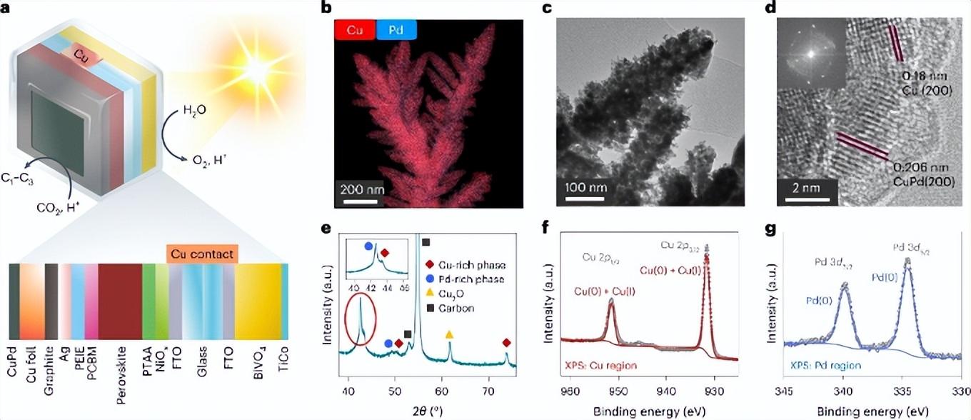 图 1. 双金属催化剂的人造树叶示意图及其表征。 a,无辅助偏压的 BiVO4-钙钛矿|Cu94Pd6 人造树叶示意图。 b–g,氧化物衍生的 Cu94Pd6 催化剂的 STEM-EDX 映射图 (b)、TEM 图 (c)、HR-TEM 图 (d)、粉末 XRD 图 (e),以及 Cu (f) 和 Pd (g) 区域的 XPS 图(灰点表示数据点;彩色线表示拟合)。