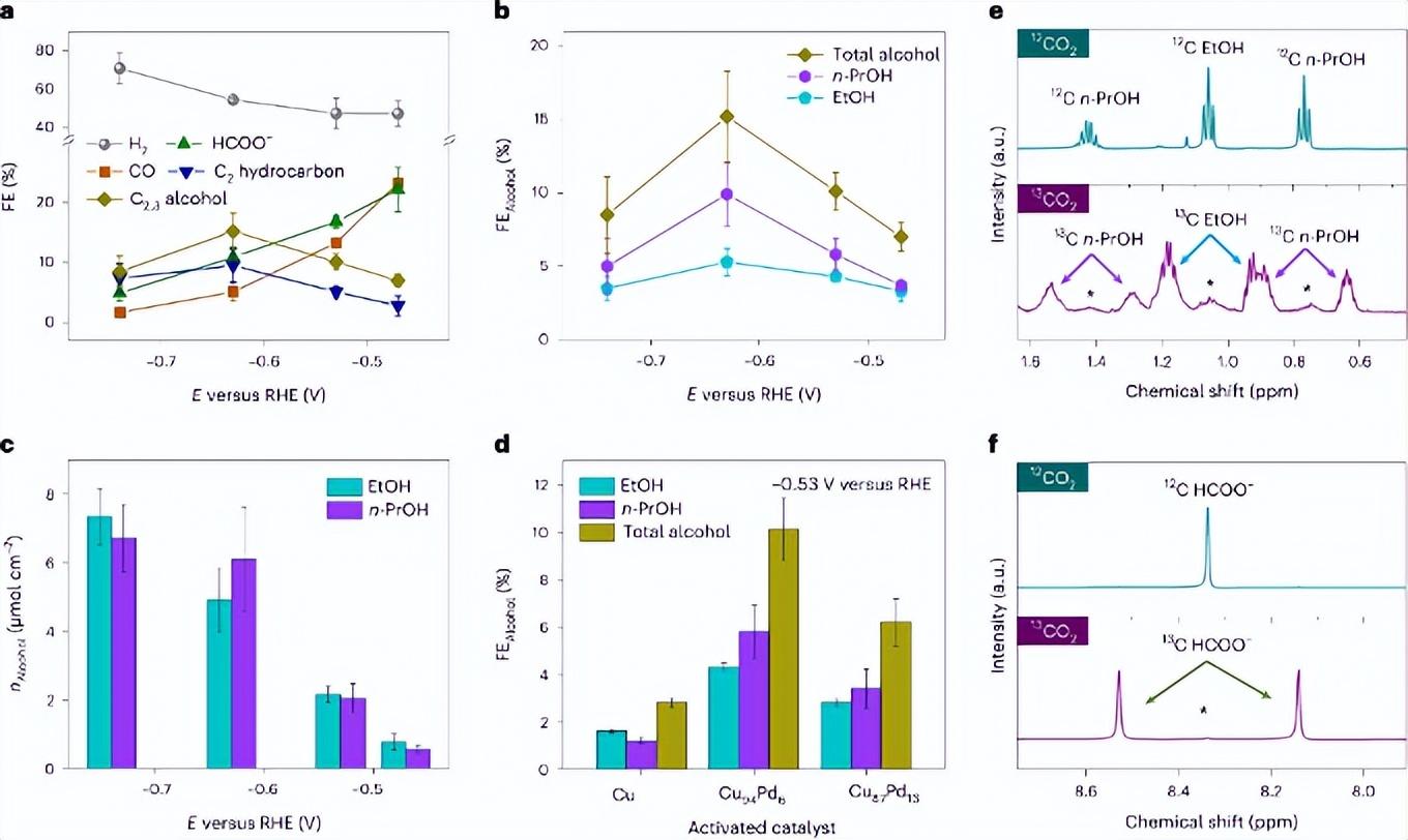 图 2. CuxPdy 催化剂的电化学分析。 a,在活化的 Cu94Pd6 催化剂上,在不同电位下的不同产物法拉第效率(FE)。 b, c, 在受控电位电解实验中,乙醇的 FE (b) 和产量 (nAlcohol) (c)。 d,不同组分的 CuxPdy系统的活性比较。 e, f, 同位素标记实验;在-0.53V vs RHE 下,测试 12 h,使用 12CO2 饱和以及 13CO2饱和的 0.5 M KOH 电解液(pH 7.3)。通过 1H NMR 光谱证明多碳醇 (e) 和甲酸盐 (f) 是由 CO2 产生的。