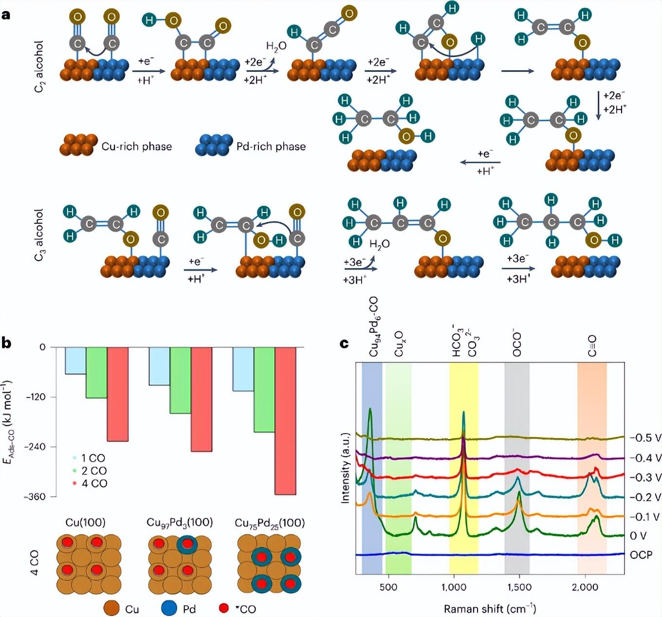 图 3. 在低过电位下,在活化 Cu94Pd6 催化剂上的多碳生产的机理分析。 a,在相分离的 CuPd 系统上,形成多碳醇的机理示意图。 b,DFT 研究,证明了与纯金属 Cu 相比,CuxPdy 系统更倾向于 *CO 吸附。。 c,活化的 Cu94Pd6 催化剂的 Operando 拉曼光谱;在非常低的过电势下有很强的 *CO 吸附,这可以解释催化剂的多碳活性。