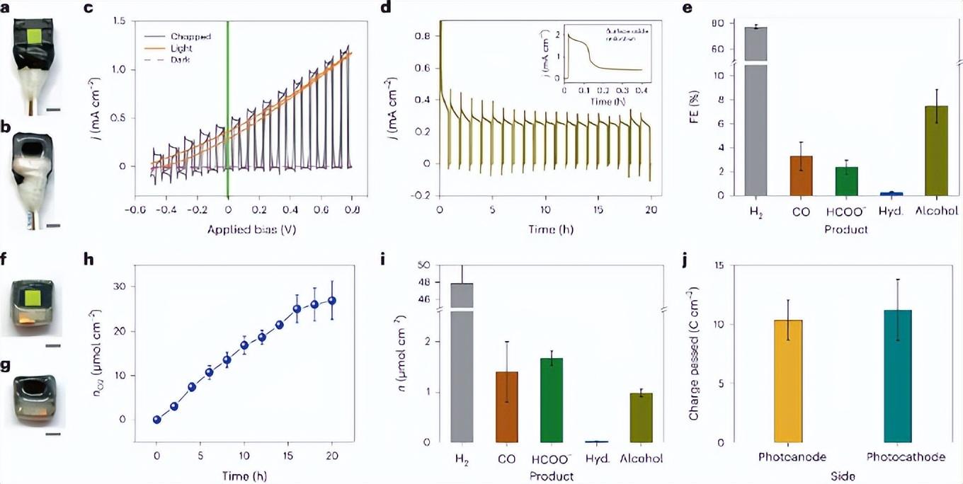 图 4. 使用有辅助偏压串联 BiVO4-钙钛矿|Cu94Pd6 设备和无辅助偏压独立人造树叶的无辅助多碳醇生产。 a,b, 有辅助偏压串联人造树叶装置的照片;显示了 BiVO4 侧 (a) 和 Cu94Pd6 催化剂侧 (b)。比例尺,5 mm。 c,在斩波、连续和无模拟太阳光照明(AM 1.5 G;100mW cm-2;扫描速率,10mV s-1)下,使用有辅助偏压串联装置的CV 曲线。 d,20 小时无偏压 CO2 光电解测试。插图:由于表面氧化物还原导致的高初始光电流。 e,20小时无辅助CO2光电解产物的FE。 f,g, BiVO4 侧 (f) 和 Cu94Pd6 催化剂侧 (g) 的无辅助偏压独立人造树叶的照片。比例尺,5 mm。 h,来自独立人造叶的光电 O2 产量,其中 nO2 表示产生的氧气量。 i,光照射 20h 后(1 个太阳光强,AM 1.5 G),独立设备在光电阴极处形成的产物量 (n)。 j,运行 20 小时后,基于独立设备的光电阴极和光电阳极侧检测产物而计算的电荷平衡。