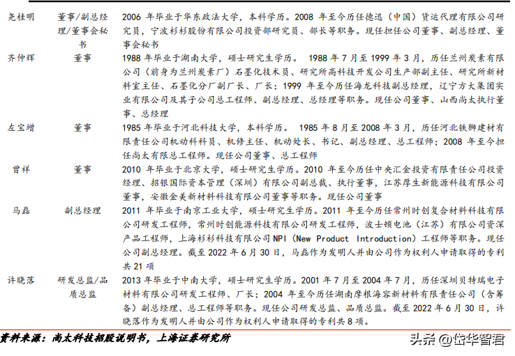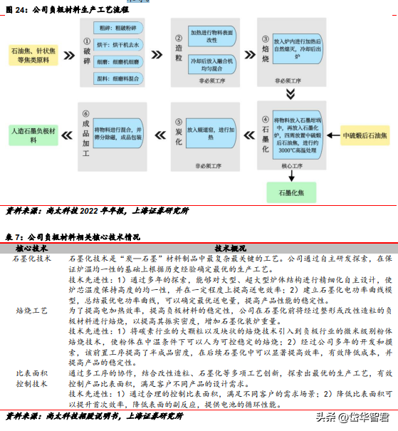 核心领域经验丰富。人造石墨负极材料生产周期长,工序较多,包括破碎、造粒、焙烧、高温石墨化、炭化和成品加工等六大工序,其中石墨化是最核心的工序。