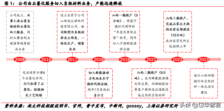 2018年公司切入宁德时代供应链,2019-2022 年先后在山西昔阳完成3万吨、5万吨、12万吨负极材料产线建设,2023 年进行山西四期 30 万吨负极材料一体化项目建设。