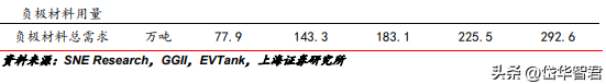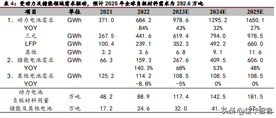 受锂电池下游市场规模增长驱动,负极材料总需求量逐年提升。结合 SNER、GGII、EVTank 相关数据,我们预计 2025 年全球负极材料需求将达到292.6万吨,2022-2025年 CAGR为27%。