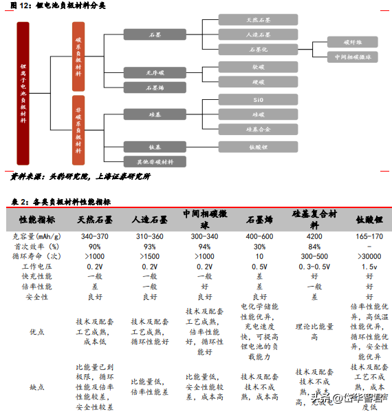 动力锂电池负极材料按活性材料可分为碳系及非碳系材料两大类别。其中,碳系负极材料包括人造石墨、天然石墨等石墨材料,无序碳材料及石墨烯材料;非碳系负极材料包括硅基、钛基及其他非碳材料。