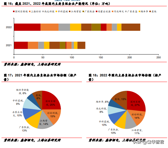 负极材料行业产能扩张速度快,竞争趋于激烈。根据鑫椤锂电数据,截至 2022 年底,国内主要负极企业产能达 218.3 万吨,同比+77%,行业供过于求下,竞争趋于激烈。