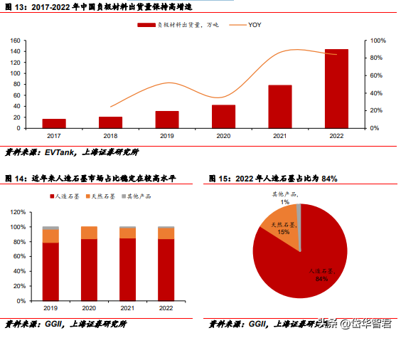 从产品结构看,人造石墨占比稳定在较高水平,2022 年占比 为 84%,主要系人造石墨材料更符合动力锂离子电池高容量、高倍率、高安全的发展方向。