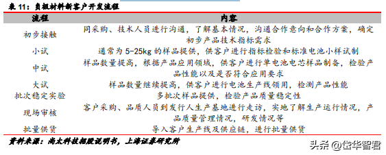 负极材料供应商认证周期长,在进入锂电池厂商供应链后,通常相对稳定。下游客户选择供应商之前,通常需要经过送样小试、中试、大试、批次稳定性试验等严格复杂的产品测试程序,最终实现批量供应,周期较长。