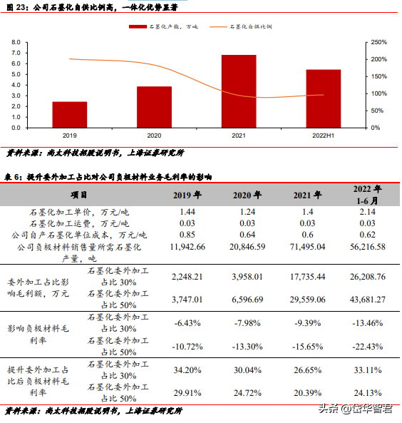 据公司参考自身成本测算,以 2022H1 为例,若石墨化委外加工占比为 30%,则毛利率下降 13.46pct;若石墨化委外加工占比为 50%,则毛利率下降 22.43pct。