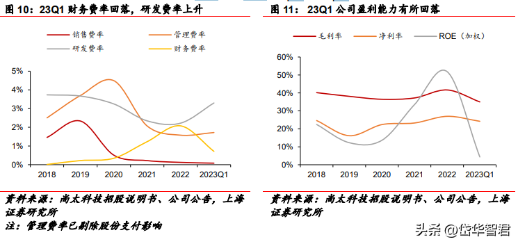 具体来看,2020 年销售费率降至 0.5%,系新收入准则规定仓储与物流费由销售费用转入营业成本,此后销售费率稳定在较低水平;2019~2022 年管理费率由 3.7%降至 1.6%,2023Q1 略增至 1.7%;2023Q1 财务费率较 2022 全年有所回落,主要因为上市募集资金到位后利息收入增长,票据贴现等形成的利息费用减少;2023Q1 研发费率有所提升,系公司为维持和提升技术优势,加大了研发人员招聘规模与研发投入。