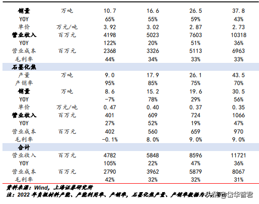 考虑负极材料行业一体化产能扩张速度较快,石墨化焦供给大幅提升,市场竞争加剧,预计石墨化焦价格、产销率呈下降趋势,2023~2025 年石墨化焦单价分别为 0.40、0.37、0.35 万元/吨,销量分别为 15.2、19.6、30.5 万吨,则营收分别为 6.09、7.24、10.66 亿元。