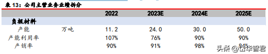 负极材料:结合公司产能规划及投产节奏,假设 2023~2025 年有效产能分别为 24.0、30.0、50.0 万吨。