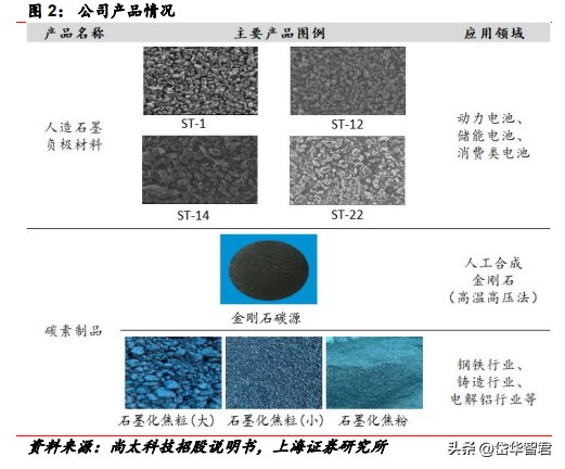 人造石墨负极材料产品包括ST-1、ST-12、ST-14、ST-22T等多种型号,应用领域包括动力电池、储能电池和消费类电池。