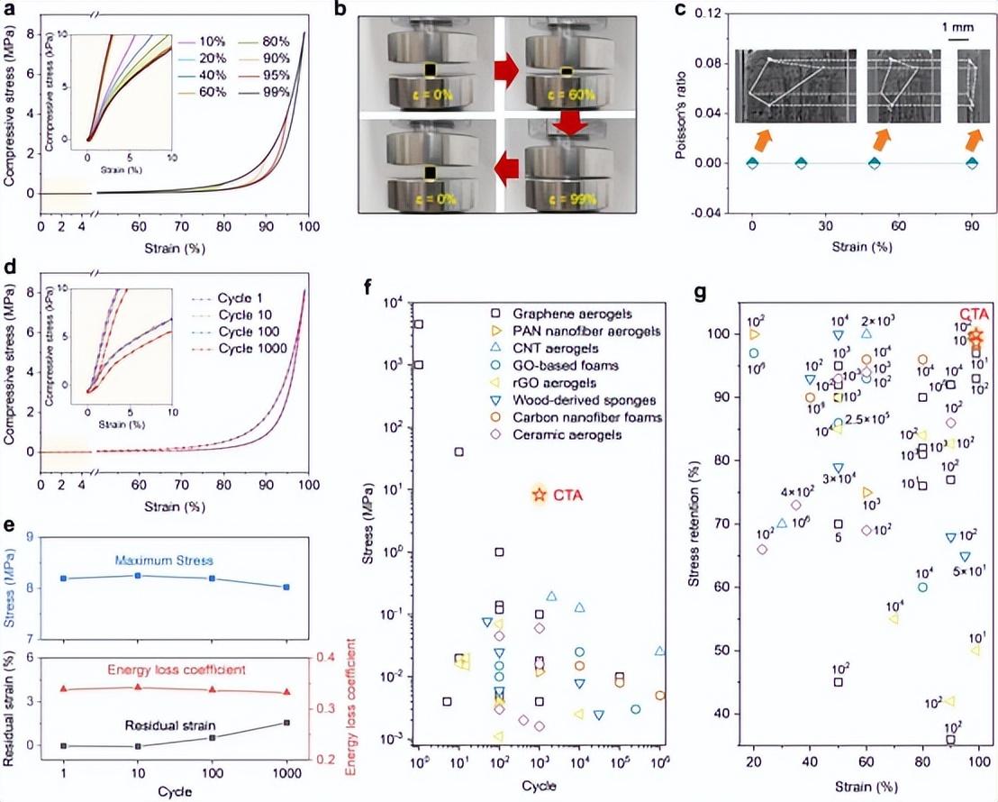 实验快照的断面图和原位SEM观察期间单轴压缩都证实了CTAs表现出接近零的泊松比。这种特性可以限制局部的间接拉伸,减少永久变形,提高压缩期间的尺寸稳定性。接着评估了我们的CTAs的抗疲劳性。通过循环测试,观察到CTAs的第100次和第1000次循环与第1次循环相比几乎没有变化,显示出高达97.9%的最大应力保持率(第1次循环为8.19 MPa,第1000次循环为8.02 MPa),并且在ε=99%时,剩余应变小于1.5%。第1个循环的能量损失系数为0.338,表明在压缩过程中,能量损失可以通过碳管之间的界面滑动发生。经过1000次循环,CTA的能量损失系数略微下降到0.332,表明在循环压缩过程中几乎没有明显的损坏或结构崩溃。CTAs,拥有高的机械强度、压缩回弹性和抗疲劳性,与其他材料相比是最具弹性和耐用性的材料之一。