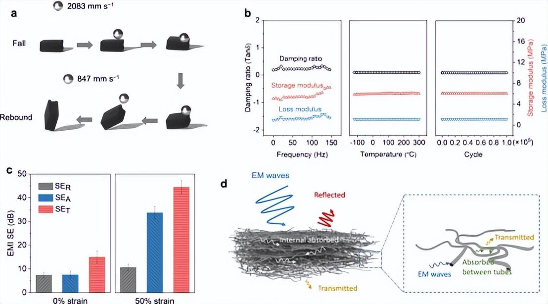 图5. 碳管气凝胶(CTAs)的动态机械性能和电磁干扰(EMI)屏蔽性能