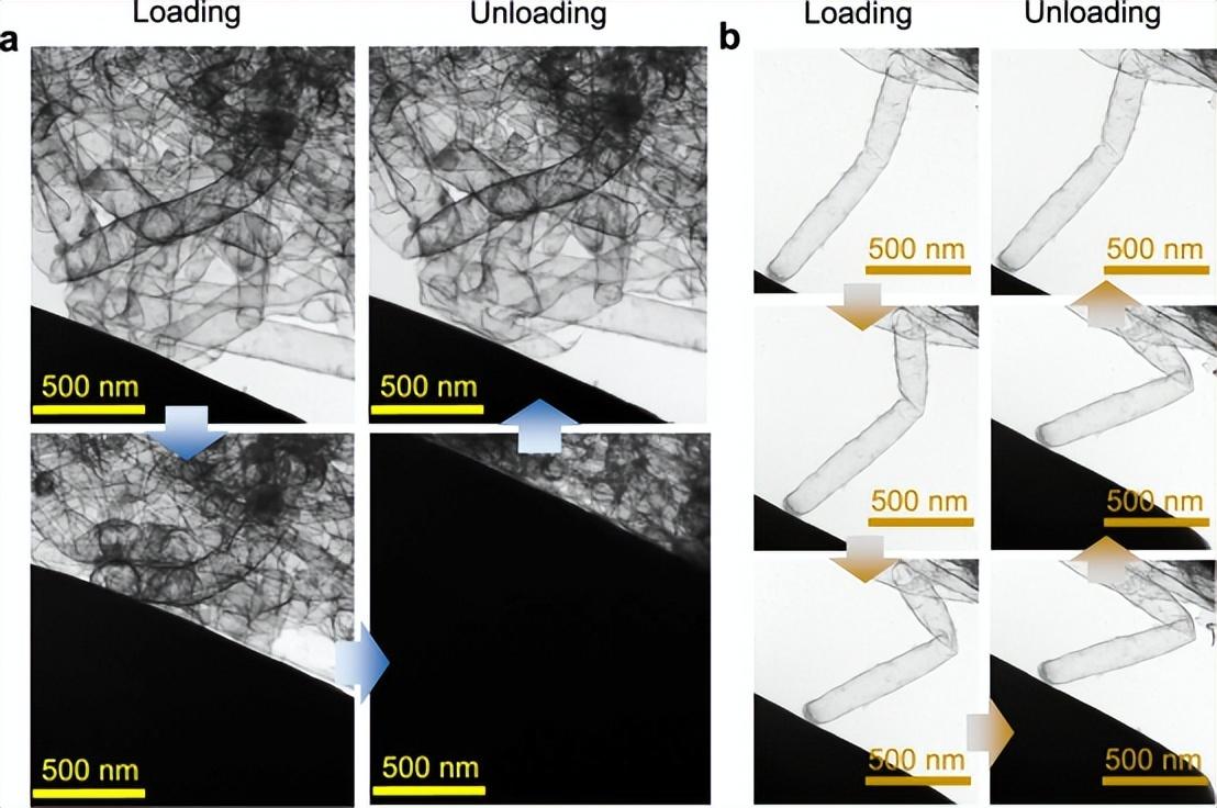 为了深入了解CTAs的可逆压缩机制,利用原位TEM来观察压制和释放过程中的结构演变。靠近压头的管子最初向单轴压缩方向移动。随着压痕深度的增加,加载力通过接头转移到邻近的碳管,导致更大范围的碳管变形。这种现象阻碍了局部应力集中和永久性损坏,因为管子可以移动到最合适的位置。这种解释也解释了CTAs的高机械值。对一根管子的原位TEM观察证实了碳管在压缩过程中的弯曲、旋转和扭曲。在释放负载后,被压缩的碳管会弹回其原来的形状,显示出良好的弹性和灵活性。