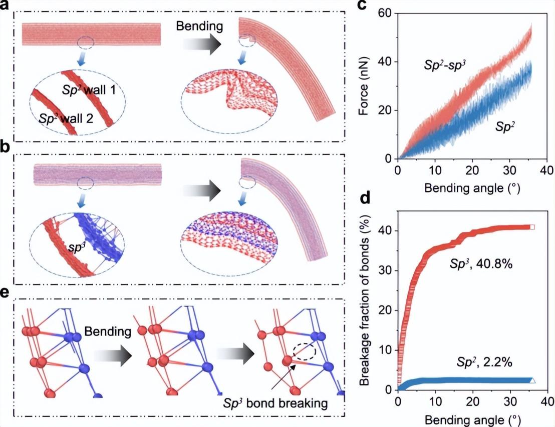 为了更深入地了解碳管的原子弯曲作用,进行了分子动力学(MD)分析。众所周知,纯sp2碳管的管壁通过局部sp2杂化结合,管壁之间通过范德瓦尔斯力连接。当管子弯曲时,这些微弱的相互作用允许相对运动,如皱褶、滑动和管壁分离。尽管这些局部运动有助于防止sp2键的断裂(sp2键的断裂率很低,只有2.2%),但它们对管子的弯曲稳定性和整体强度有消极影响。