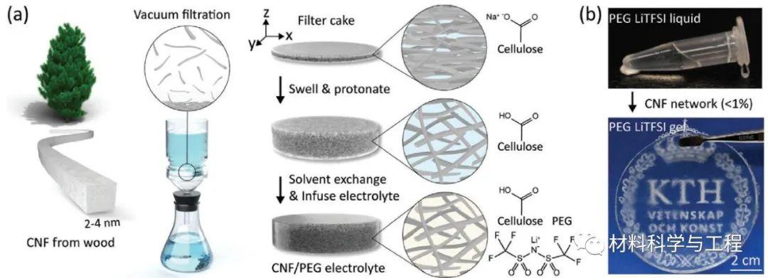 图1. CNF/PEG电解质的制备示意图。a) 制备过程示意图;b) PEG/LiTFSI电解质和电解质注入膜的照片。