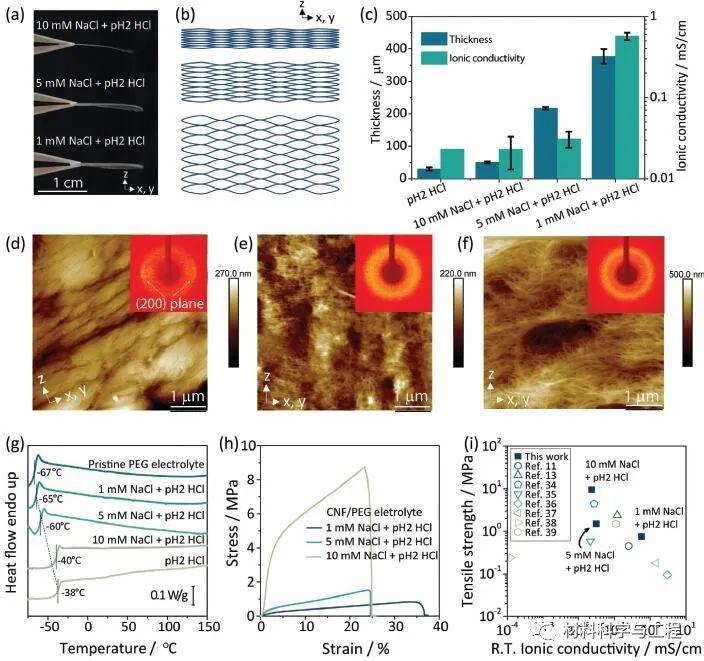 图2. 具有可调性能的CNF/PEG电解质。a) CNF/PEG电解质厚度差照片;b) 不同浓度NaCl溶液中溶胀引起的孔隙结构差异示意图;c) CNF/ PEG电解质的厚度和离子电导率; 经d) 10 mM NaCl + pH2 HCl、e) 5 mM NaCl + pH2 HCl和f) 1 mM NaCl + pH2 HCl预处理的CNF/PEG电解质的截面AFM图像和二维WAXS图;g) DSC曲线和h) CNF/PEG电解质的拉伸应力-应变曲线;i) CNF/PEG电解质的离子电导率和抗拉强度与先前报道的进行对比。