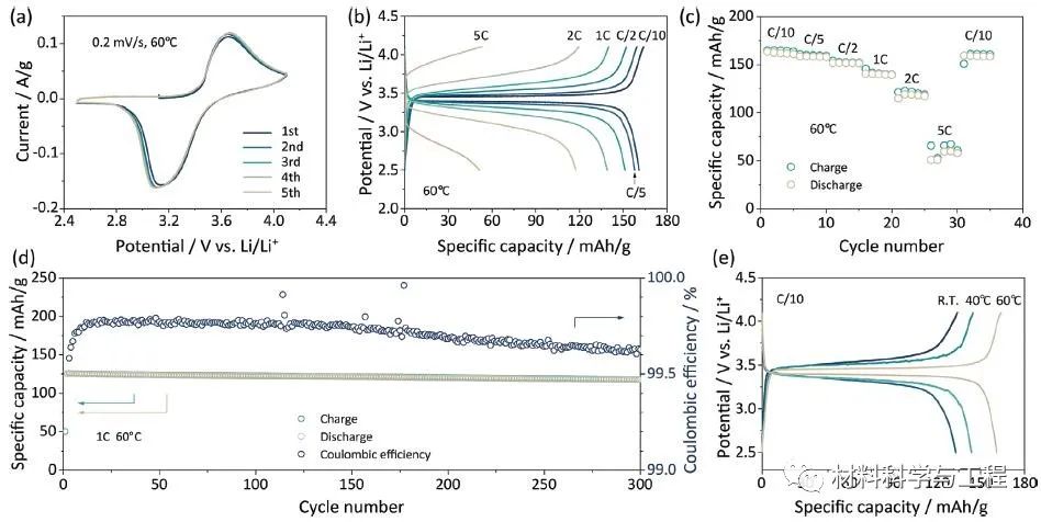 图5. CNF/PEGDME电解质|Li半电池性能。a) 扫描速率为0.2 mV s−1时前5次循环的CV曲线,b) 不同电流密度下的充放电曲线,c) 倍率性能,d) 循环稳定性,e) 不同测试温度下的充放电曲线。