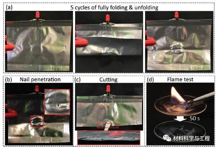 图6. 安全示范。照片显示了使用CNF/PEGDME电解质作为隔膜的软包电池的弹性:a) 折叠和展开,b) 钉子穿透,c)切割;d)显示CNF/PEGDME电解质内部阻燃性的照片。