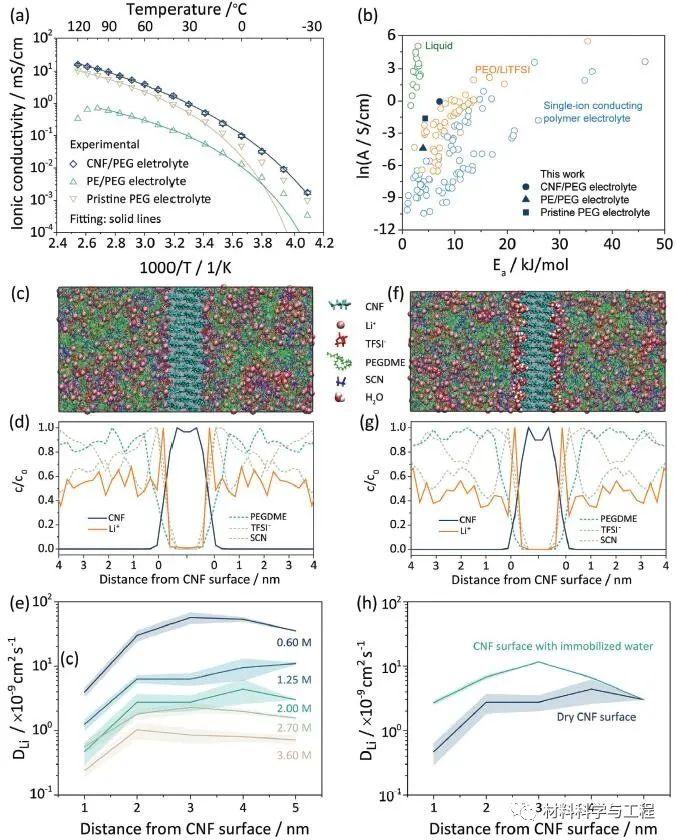 图3. 电解质的离子电导率。a) 不同温度下电解质的离子电导率;b) 与不同电解质体系相比,VTF前因子作为电解质表观活化能函数的自然对数;c) 由CNFs和PEGDME电解质组成的模拟系统的快照;d) 聚乙二醇二甲基醚电解质在CNFs周围的分布;e) 不同LiTFSI浓度下CNF表面不同距离处锂离子扩散系数的变化;f) 由CNF、PEGDME电解质和水组成的仿真系统的快照;g) 固定化水存在时聚乙二醇甲基醚电解质在CNFs周围的分布;h) 有水和无水电解质体系的锂离子扩散系数。
