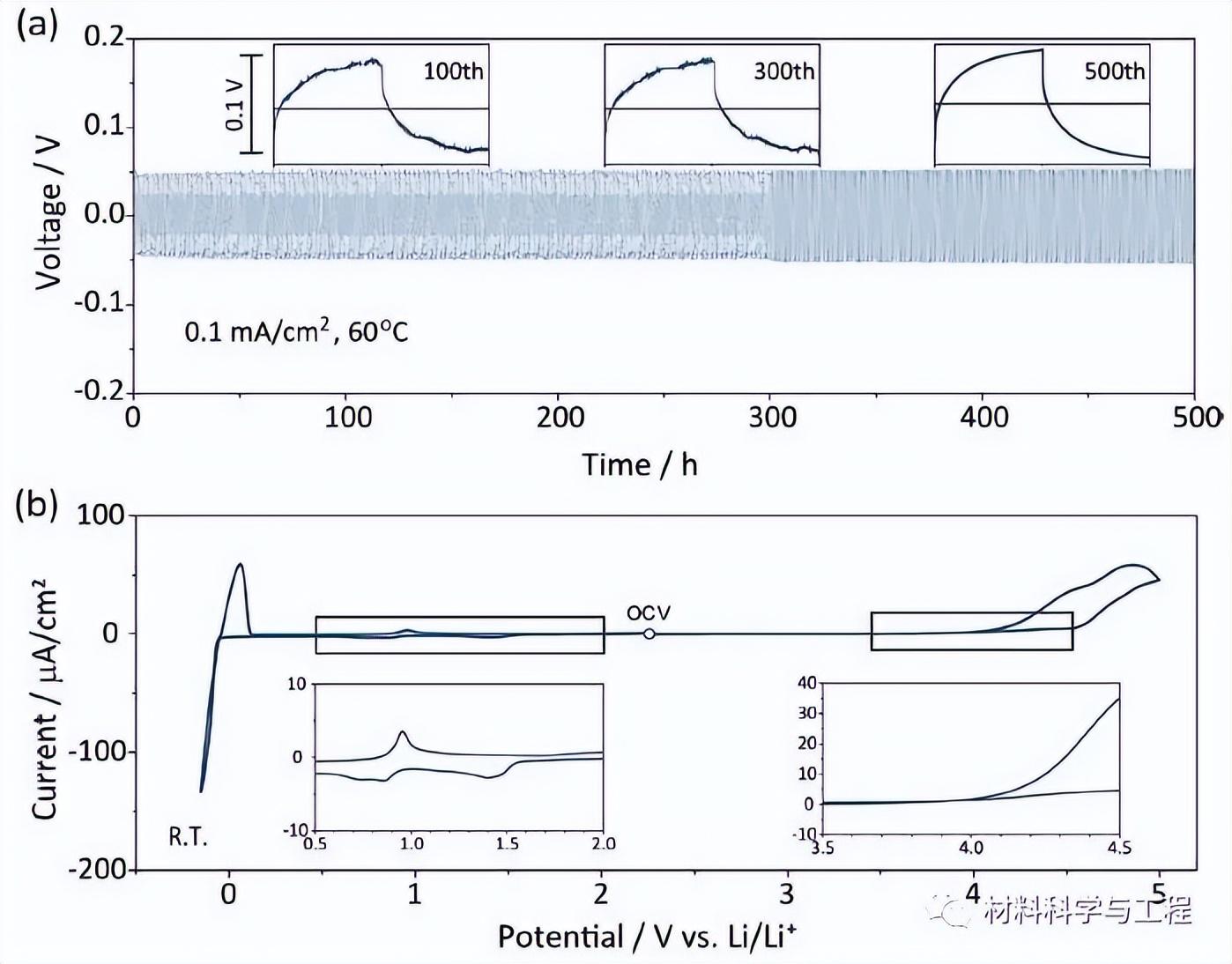 图4. CNF/PEGDME电解质的电化学稳定性。a) 在0.1 mA cm−2下对对称锂|CNF/PEGDME电解质|锂电池进行锂剥离/镀锂试验;(b)不锈钢(SS)|CNF/PEGDME电解质|锂电池的CV曲线。