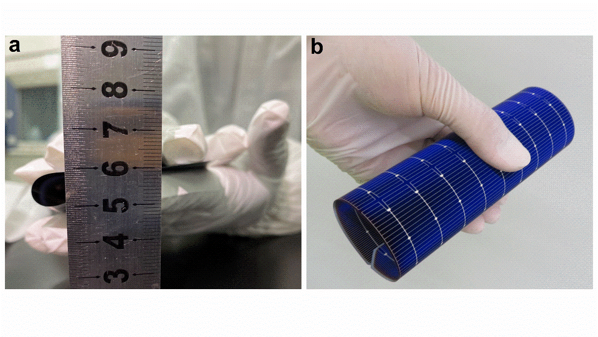 a, 柔性太阳电池硅片弯曲半径小于5毫米;b,柔性太阳电视弯曲角度超过360度。
