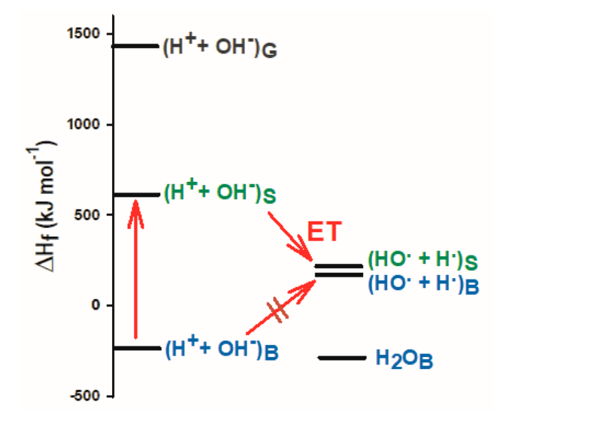 图|(来源:Journal of the American Chemical Society)小时候玩磁铁的时候,我们总是忍不住将相同的一极对在一起,并用力捏住。然而,当放开双手的时候,磁铁总是不出意外地分开。后来上学的时候,老师告诉我们,这是同极相斥,异极相吸。这种现象在喷洒水的时候也会出现。科学研究表明,水在喷洒的过程中会产生一些有趣的现象,比如正负微滴。正负微滴是指带有过量的质子(H+)或氢氧根(OH−)固有离子的微水滴(SWMs)。不论是H+还是OH−,一旦这些离子过量,就会相互排斥到SWMs的最外层,在那里它们会产生与其净电荷成比例的通量电场。也就是说,形成这种现象的作用是由于多余离子的静电作用,而不是离子对空气—水界面的特定亲和力。SWMs上发生的一个有趣的化学反应就是在喷洒的纯水中形成H2O2。H2O2是在水的OH−氧化过程中产生的羟基自由基HO•结合而产生的。然而,由于H+离子是纯水中唯一可用的受体,因此目前尚未解决的问题是:为什么表面结合过量的OHS−和HS+离子在收集时,正负微滴之间发生电子转移(ET),即反应R1;而喷洒水中的HOB−和HB+离子不发生电子转移,即反应R2。根据热力学数据表明,由于HOB•和HB•自由基的形成,反应R2是吸热反应:ΔH2 =ΔHf(HOB•) + ΔHf(HB•) − ΔHf(HOB−) − ΔHf(HB+) = 448 kJ mol−1;其中,H+代表其所有水合变体,从气相HG+到整体水中的水合氢H3OB+。图|气相中的生成焓(kJ mol−1)(G);通过假设表面结合离子由气相的水合焓的一半稳定而估计的喷雾水微滴的表面(S)和喷洒水中(B)。(来源:该论文)作者表明,R1和R2的区别在于,反应R1发生在极其干燥的SWMs最外层的HOS-和HS+离子之间。这说明HOS-和HS+离子的水化焓绝对值明显小于HOB-和HB+离子。假设反应R1的反应物和产物在SWMs表面的水化焓仅为气相(G)的一半,则反应R1变为放热反应:ΔH1 = ΔHf(HOS•) + ΔHf(HS•) - ΔHf(HOS−) - ΔHf(HS+) = -375 kJ mol -1;ΔHH(HOG•) = -39 kJ mol−1, ΔHH(HG•) = -19 kJ mol−1;小气相(G)反应物离子(H)的水化焓(H)与ΔHH(HG+)=-1150 k Jmol−1离子(H)的水化焓(H)之间的巨大差异保证了对HOS−和HS+离子水化程度的任何现实假设,或使用吉布斯自由能平衡将得出类似的结论。即考虑了反应R1中可能阻碍ET的所有动力学障碍。在此背景下,普遍存在的假设认为,H2O2是由水偶极子重定向内部产生的电场在SWMs表面自发产生的。值得注意的是,这个假设没有提到在这些场的影响下HO-离子释放电子的问题。因此,如上所述,建立假定的电子受体的身份并评估相关ET步骤的热力学至关重要,因为单独的内部电场(即在没有能量输入的情况下)不能驱动吸热ET。事实上,最近的计算表明,中性微滴表面的内部电场强度与大量水中相似。但如果这种结果正确,电场理论就会预测H2O2会在喷洒水中产生,这与所有的证据相悖。需要强调的是,ET通路的开启,即R1反应,不仅是H2O2形成的原因,也是SWMs表面氧化还原化学的原因。其中,HOS−作为一种有效的还原剂,将HS+转化为HS•原子,同时转化为强大的HOS•自由基氧化剂。此外,HOS−可以直接将添加的底物(如吡啶)还原为碳阴离子,而HOS•则可以提取H原子并将其他物质氧化为碳阳离子。这些中间体的氧化还原电位,以及ET(反应R1)和离子重组(反应R3)之间的竞争,需要描述SWMs上可能的氧化还原反应范围整个过程,即从液相中的水吸热形成H2O2:ΔH(2H2O=H2O2+H2)=384kJ mol−1,显然是由喷水所提供的能量来驱动。然而,只有一小部分能量输入被引导到雨水管理设施表面,促进过量的HOS−和HS+离子。通过喷洒电中性水形成带电微滴是小型雨水管理设施区域中离子浓度统计波动放大的自然结果。喷洒水所需的能量大于将HOS−和HS+离子放置在雨水管理设施表面所需的能源,因为输入能量将主要通过喷雾喷嘴,并提供雨水管理喷雾的大表面、动能和静电能。因此,预计将机械能转化为喷射水中的化学势是相当低效的。看似与我们生活毫无关系的研究,却在现实生活中随处可见,这是因为,水离子机械分离成带电微滴是一种普遍的自然现象。瀑布底部冲击的水、风暴引起的海浪破碎、云收到对流气流的撞击等,都会产生带电微滴。这几个例子表明,带电微水滴表面的化学反应不仅仅是实验室里的新奇事物,而是SWMs界面化学的一个基本特征。