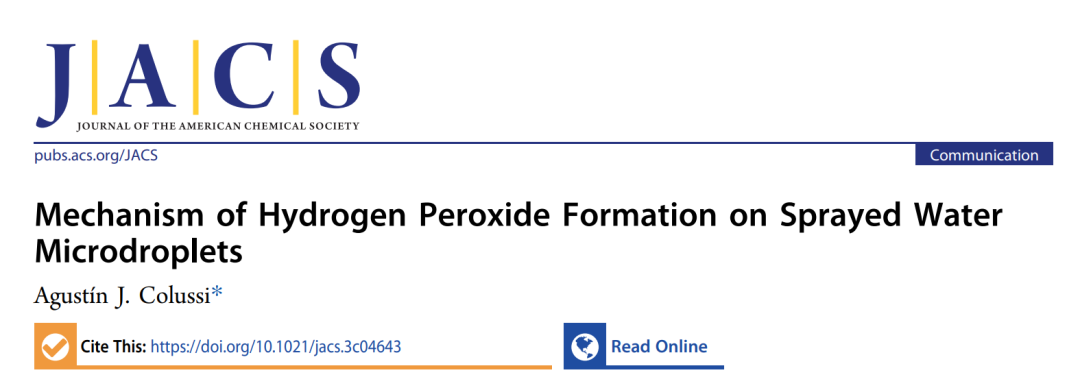 然而,你有没有发现,最近几年医院里消毒水的味道逐渐淡化,这是因为他们使用双氧水代替了之前有刺激性气味的消毒液。双氧水,学名过氧化氢(H2O2)水溶液,是一种具有消毒杀菌作用的无色透明液体。事实上,看起来结构式如此简单的过氧化氢,制备起来确却并不简单,需要一定的条件下进行复杂的化学反应。近日,来自加州理工学院的科学家Agustín J. Colussi提出,纯水中过氧化氢的形成可能与中性微滴表面的内部电场作用下HO−离子自发产生的HO•自由基的结合有关,并阐述了形成过程的机理。该研究以“Mechanism of Hydrogen Peroxide Formation on Sprayed Water Microdroplets”为题目发表在期刊Journal of the American Chemical Society上。