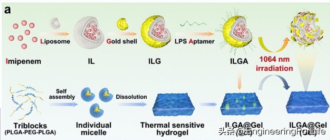 在此,作者首次构建了NIR-II响应性纳米杂化物作为有效的抗菌剂。如图1所示,作者将亚胺培南(IMP)负载于脂质体囊泡中以获得IMP@Liposome(IL)。然后,通过Au3+还原在IL的外膜上原位形成金壳,并且还进一步修饰脂多糖(LPS)适体以产生ILGA。LPS适体是一种核苷酸序列,可以形成特定的3D结构来结合LPS,从而使ILGA能够靶向细菌以提高PTT效果。在NIR-II光照射(1064nm)下,ILGA的金壳和脂质体可以破裂,释放出包封的IMP,用于协同消除细菌。此外,作者还采用生物相容性热敏水凝胶(PLGA-PEG-PLGA)作为ILGA负载的基质构建了ILGA@Gel水凝胶敷料。
