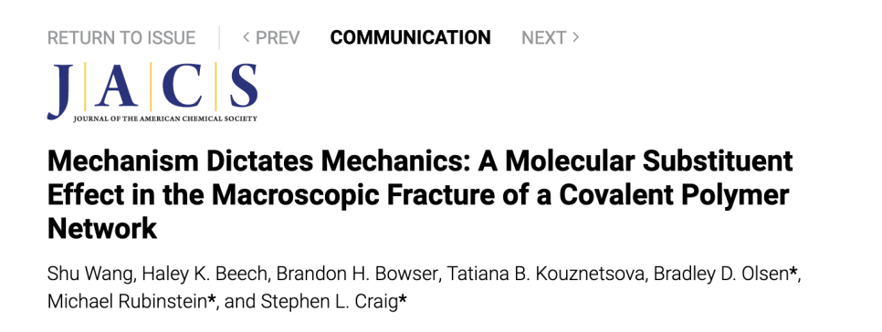 2021年,化学出身的王澍就曾在化学类顶刊JACS上发表过一项关于断裂的研究。在这项研究中,他和团队将聚合物网络中较常见、也最稳定的末端交联剂——碳碳单键替换为其他两种更容易断裂的交联剂,发现材料的韧性在宏观上变弱了。