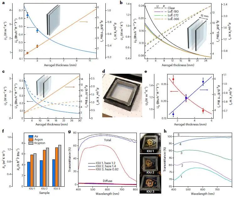 Fig. 8 Windows products containing SiCellA. a, U and R values for a single-pane window retrofitted with SiCellA. b, U and R values versus aerogel thickness calculated for a triple-pane IGU. c, U and R values versus SiCellA thickness calculated for a triple-pane IGU with a SiCellA film. d, A photograph of fabricated triple-pane 15 cm × 15 cm IGU with 3 mm-thick SiCellA film. e, Calculated (lines) and measured (symbols) U and R for a triple-pane IGU shown in d. f, Calculated R values for triple-pane aerogel IGUs. g, Spectral dependence of total and diffuse transmittance of triple-pane IGUs. h, Spectral dependence of total visible transmittance of a triple-pane IGU.