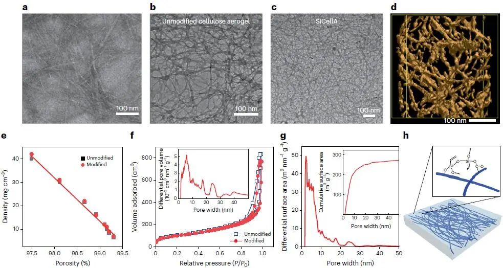 Fig. 3 Nanoscale morphology of studied aerogels. a, b, TEM images of ultrasonicated TEMPO-oxidized individual cellulose nanofibres in aqueous dispersions negatively stained with 1% phosphotungstic acid (a) and an unmodified nanocellulose aerogel (b). c, d, TEM image of a silanized aerogel (c) and corresponding tomographic TEM visualization of a SiCellA (d). e, Density of modified and unmodified aerogels depending on porosity. f, N2 adsorption and desorption isotherms for modified and unmodified aerogels at 77 K. g, Distribution of a differential pore surface area depending on a pore width for SiCellA. h, Schematic diagram of a SiCellA formed by a network of thin cellulose nanofibres (dark blue lines) with silanized surfaces.
