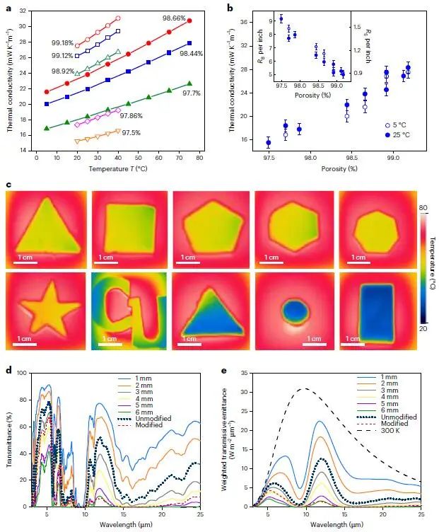 Fig. 5 Thermal properties of SiCellA. a, Temperature dependence of thermal conductivity of SiCellA at different porosities. Solid lines are guides to the eye. b, Thermal conductivity dependence on SiCellA porosity at 5 °C and 25 °C. c, Infrared thermal images of SiCellA films of different shapes placed on a hot plate. d, e, Raw infrared transmittance (d) and averaged infrared transmissive emittance weighted by 300 K black-body radiation (e) of unmodified cellulose based aerogels at various thicknesses (solid lines).