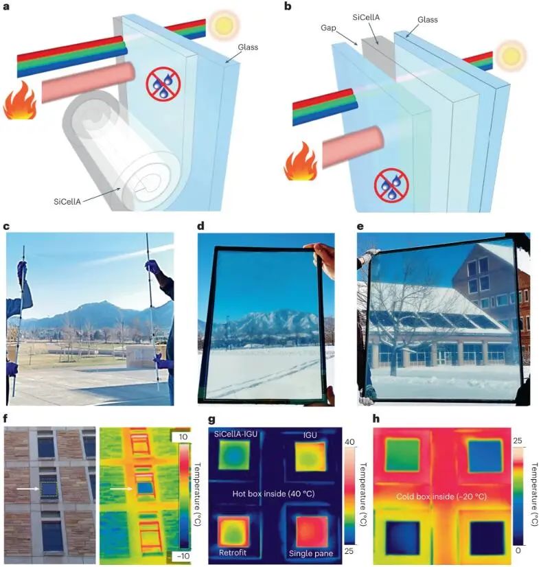 Fig. 1 SiCellA-based window retrofits and IGUs. a, b, Schematic drawings of a window retrofitted with a SiCellA film (a) and an IGU with a SiCellA film inserted between glass panes (b). c, Square-metre, 1.5 mm-thick SiCellA with 99.2% porosity adhered to an optically clear plastic film. d, e, Photos of 36 cm × 51 cm (d) and square-metre (e) double-pane IGUs with LoĒ-366 coatings on one glass pane and 3 mm-thick SiCellA films attached to a surface of the other glass panes. f, Single-pane window retrofitted with a 72.1 cm × 71.4 cm SiCellA 1.5 mm-thick film. g, h, Infrared thermal imaging photos of different types of fenestration mounted in the openings of 0.78 m × 0.68 m × 0.43 m hot (g) or cold (h) boxes with the inside temperature set at 40 °C (g) and −20 °C (h).